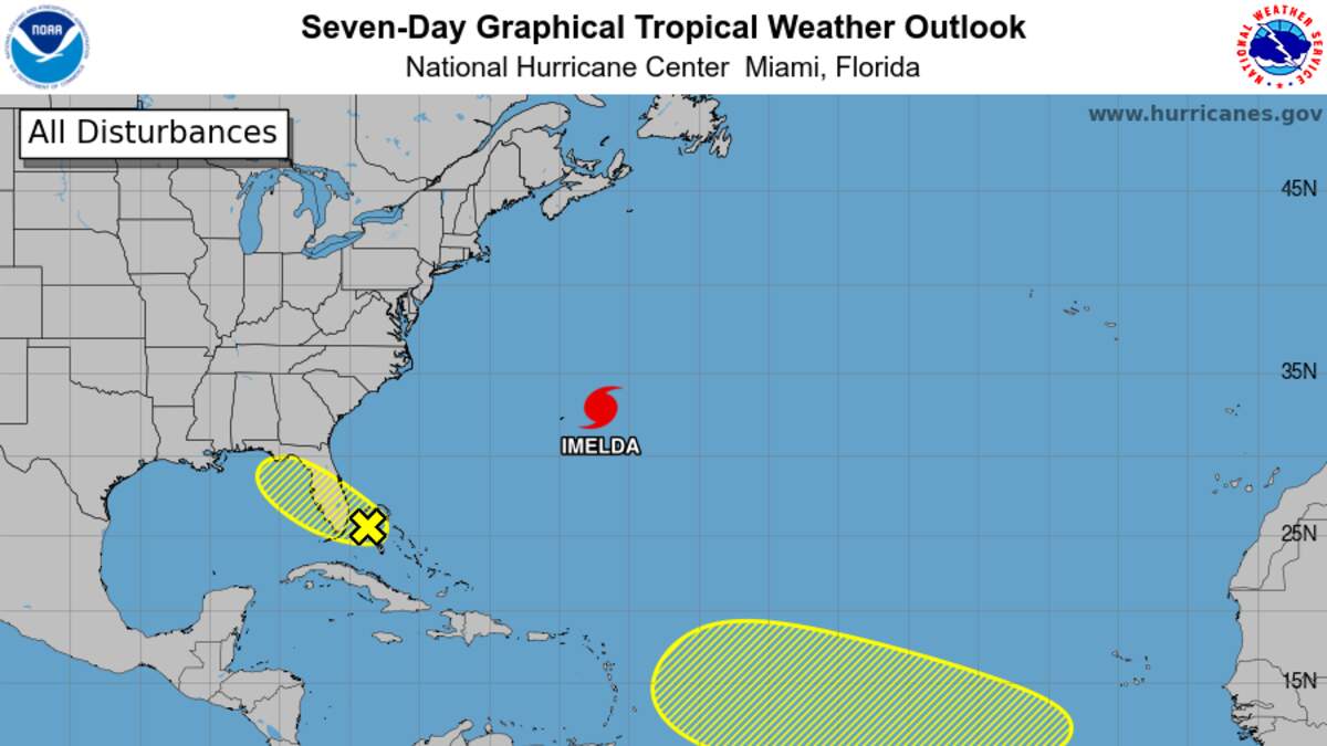 - The National Hurricane Center is tracking three systems in the Atlantic. Hurricane Imelda has passed through Bermuda and is tracking east northeast towards the northern mid-Atlantic. A disturbance in the Southern Atlantic off the Coast of Africa has a 20% chance of developing over the next seven days, while a disturbance may form off the southeastern Florida coastline moving over our state this weekend with a 10% chance of developing.